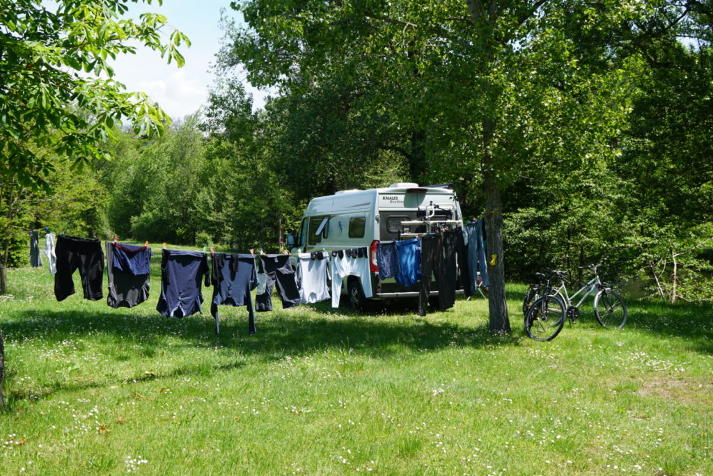 Morgens aufwachen mit Blick auf den leise gurgelnden Fluss, die Sonne blinzelt zwischen den Bäumen hindurch, die Vögel zwitschern, ein Hahn kräht – so habe ich mir das vorgestellt! Es wird sonnig und warm, ein leichter Wind weht – Waschtag!