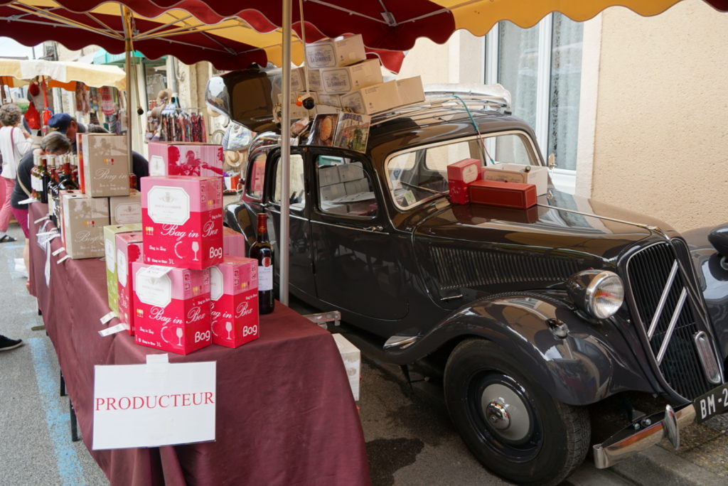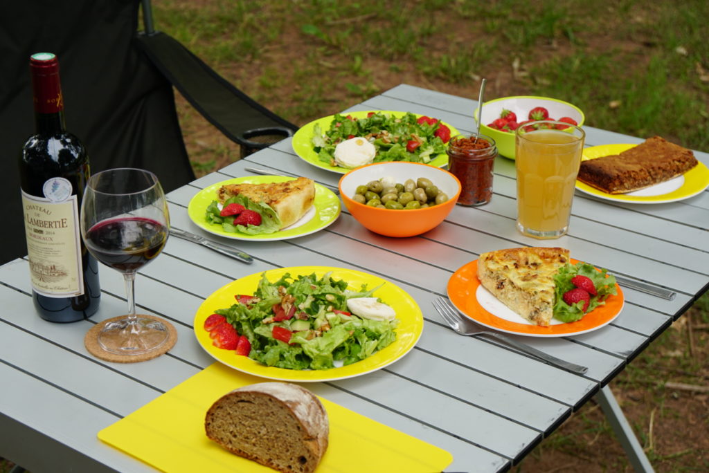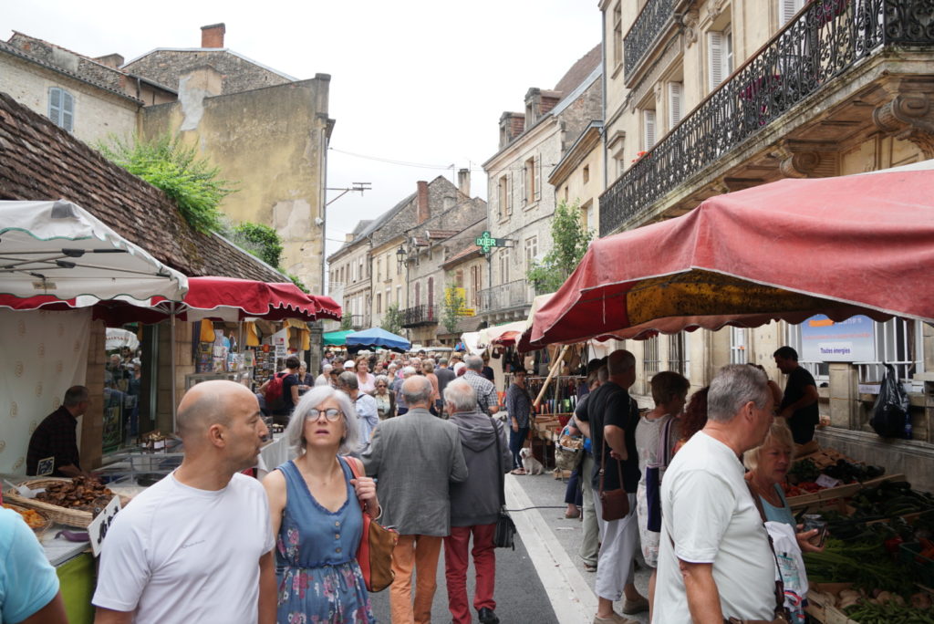 Und jetzt sind wir hier. Heute ist Markttag und wir verzichten aufs Frühstück, denn wir wollen die regionalen Köstlichkeiten probieren. Im Falle meines Liebsten bedeutet das ein pain au chocolat gefolgt von einem tartelette aux framboises. Der Markt ist riesig, meine Augen und die dann prall gefüllten Taschen auch – nur unser Kühlschrank ist winzig. Egal, Gemüse und Salat vom Biohof sehen knackig aus, es gibt endlich Vollkornbrot, die Käseauswahl ist fantastisch und bei einem Stand gibt es sechs verschiedene Sorten Erdbeeren zu kaufen! Wir schlendern über den Markt, probieren hier und da und kommen uns schon fast wie in einem Bruno-Buch vor. Die Einheimischen stehen in Grüppchen zusammen und halten einen kleinen Plausch. Es herrscht eine entspannte Atmosphäre trotz der vielen Menschen. Wir kommen auch zur Ruhe und beschließen, heute nicht mehr weiterzufahren.
