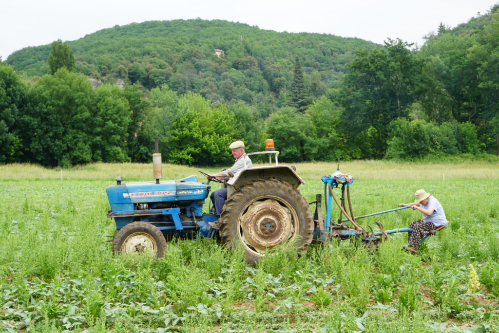 Auf dem Rückweg denke ich an all die leckeren Dinge, die wir auf dem Markt eingekauft haben. Mir läuft das Wasser im Mund zusammen und ich stelle schon mal – ganz im Stil von Bruno – gedanklich unser Menü für heute Abend zusammen: Oliven und eine Art französisches Pesto rosso (ich habe den Namen vergessen) als Vorspeise, dazu Brot. Dann Quiche mit frischem Salat (angemacht mit Walnussöl und Himbeerbalsam) mit Walnüssen und cabecou, dazu einen Bordeaux (oder naturtrüben Apfelsaft). Als Dessert gibt es tarte aux noix und frische Erdbeeren. Gedacht, getan: