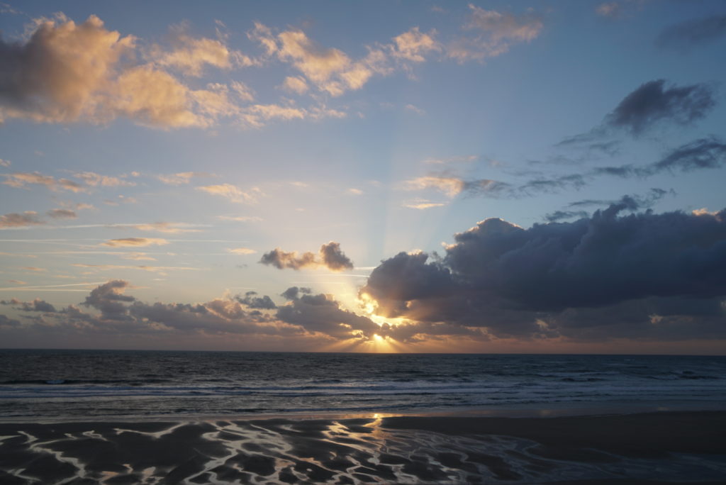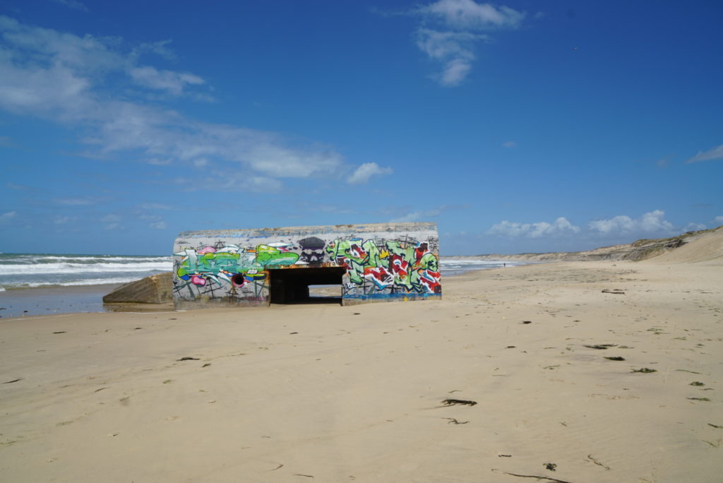 Wir fahren weiter nach Westen aufs platte Land. Unterwegs hören wir passenderweise „Mordseekrabben“. Obwohl wir noch im Médoc sind, sieht es ein bisschen aus wie in Nordfriesland. Der Atlantik begrüßt uns stürmisch. Wir halten dem Stand und machen unseren ersten Strandspaziergang. Die Luft, die gute Luft! (kleiner Insider 😉 ) Das Wasser ist allerdings noch ziemlich kalt, aber wenigstens meine Füße müssen in den Ozean! Mein Fisch zeigt sich plötzlich wasserscheu.
