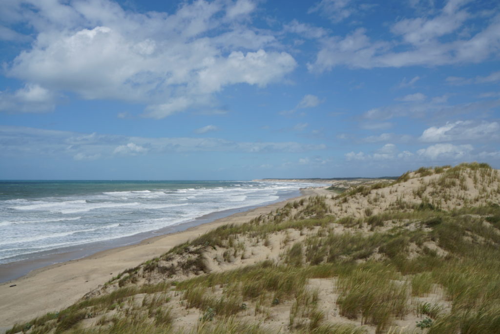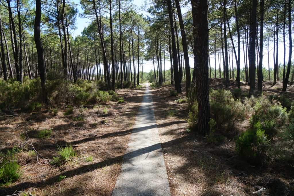Der Wind flaut ab und wir fahren bei schönstem Sonnenschein durch Pinienwälder (hier gibt es ein ausgezeichnetes Radwegenetz), werfen einen Blick auf den größten Binnensee Frankreichs (Lac d’Hourtin-Carcans), stapfen durch gewaltige Dünen und lauschen der Brandung am Strand.
