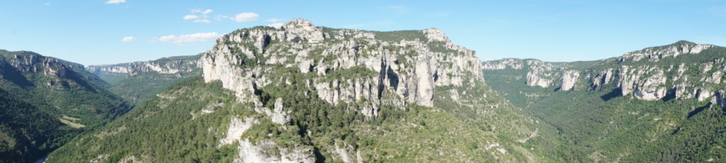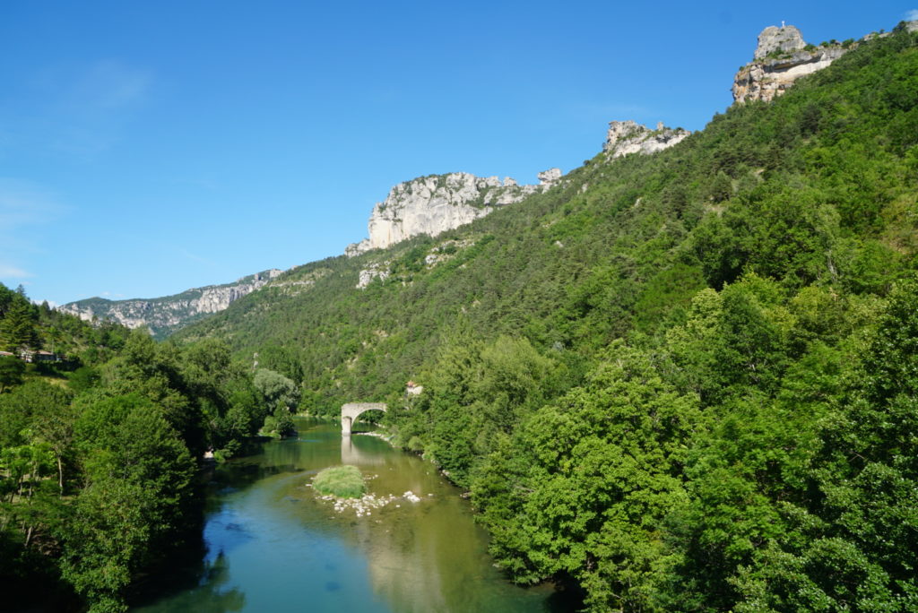 Nach so viel Kultur hält uns nichts mehr auf dem Weg zum Tarn auf. Am Eingang zur Schlucht finden wir in Le Rozier einen einfachen Campingplatz, wo wir direkt am Fluss stehen können. Und auch wenn wir schon beim Rumsitzen anfangen zu schwitzen, raffen wir uns dennoch am späten Nachmittag zu einer kleinen Wanderung zum Aussichtspunkt Capluc auf. Dass wir da über Stock und Stein kraxeln und sogar Leitern am Berg erklimmen müssen, stand nicht im Reiseführer, aber die Aussicht beim Gipfelkreuz ist wirklich fantastisch – einschließlich der über uns kreisenden Geier. Die haben wahrscheinlich bemerkt, dass mein Bergsteiger in Sandalen unterwegs ist, und haben sich schon Hoffnung auf ein fettes Abendessen gemacht, aber schließlich war mein Liebster auch schon mit Flip-Flops in den Alpen unterwegs, das macht ihm gar nichts aus!