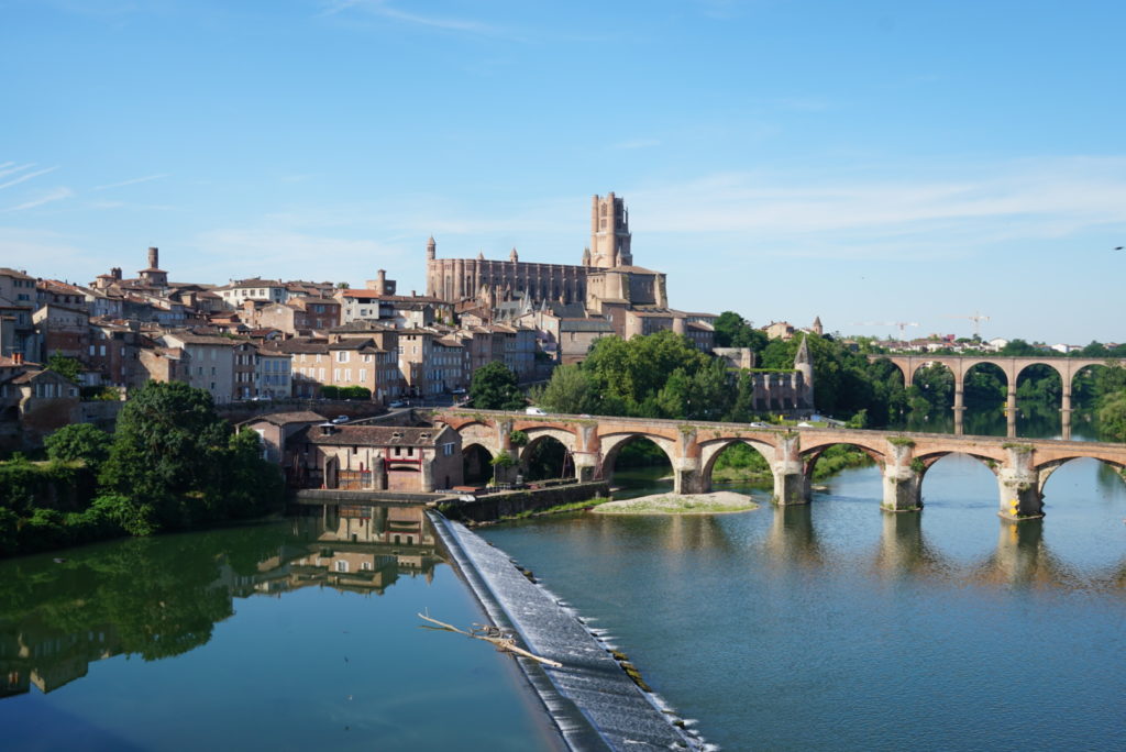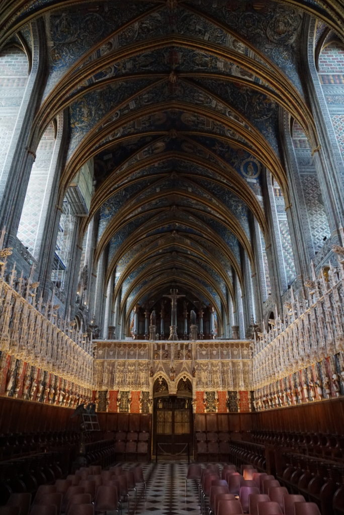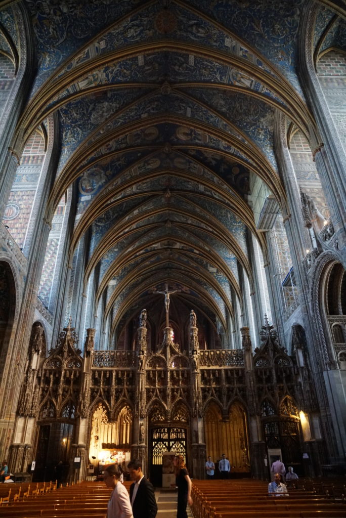 So fahren wir weiter nach Albi, das ebenfalls drei Michelin-Sterne vorweisen kann und mit zwei Attraktionen aufwartet: Das Toulouse-Lautrec-Museum (pikanterweise im Bischofspalast untergebracht) lassen wir wegen der Hitze ausfallen und besichtigen nur die Kathedrale Sainte-Cécile. Von außen will sie uns nicht so recht gefallen, auch wenn sie eine der größten Backsteinkirchen der Welt ist. Das gotische Eingangsportal steht im krassen Gegensatz zu dem festungsähnlichen Erscheinungsbild der restlichen Kirche. Das kann nicht der Grund sein, warum wir schon wieder vor einem UNESCO-Weltkulturerbe stehen. Der offenbart sich uns, als wir die Kathedrale betreten. Ich mag Euch wirklich nicht mit Kirchenbildern langweilen (wir haben mittlerweile schon einige besichtigt), aber das müsst Ihr Euch ansehen: Das Innere ist komplett bemalt, besonders sind wohl auch Lettner und Chorschranke (ich musste auch erst nachlesen, was das ist), jede Figur ist individuell ausgearbeitet.