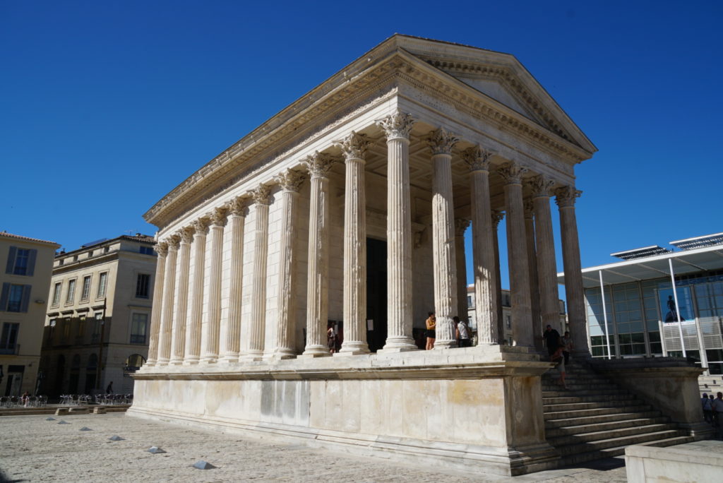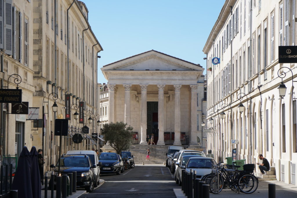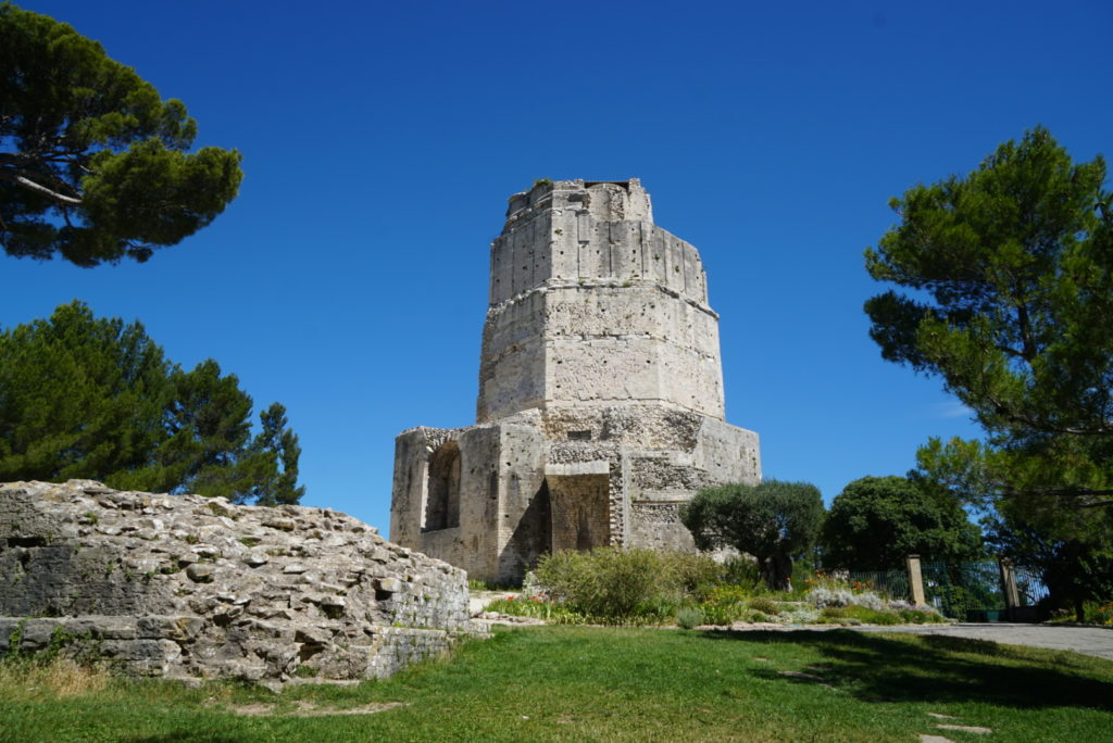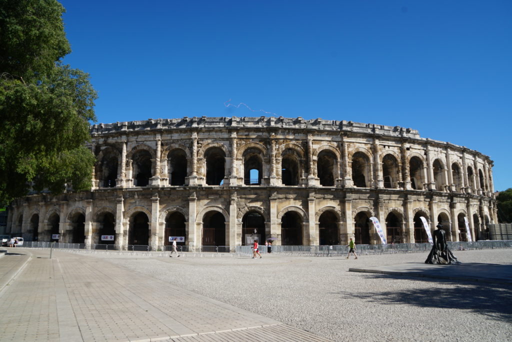 Es bleibt heiß, kein Regen in Sicht. Dafür wird es windig, sehr windig sogar, um nicht zu sagen konstant stürmisch – Tag und Nacht – ist das le mistral? Der Himmel zeigt sich jedenfalls wolkenlos und erstrahlt in einem intensiven blau. Der Campingplatzbesitzer hat uns eine Besichtigungstour für Nîmes zusammengestellt inkl. sicherem Parkplatz für unser Kaschdl. Also los, auf uns warten zahlreiche römische Relikte, die zudem gut erhalten sein sollen. Gleich zu Anfang erwartet uns eine kleine Enttäuschung: die Arena ist leider geschlossen wegen eines Konzertes. So können wir das Amphitheater nur umrunden und haben Gelegenheit, der Stadt beim Aufwachen zuzusehen. Wir bummeln durch die Gassen vorbei an gut besuchten Friseurläden, Modegeschäften und anderen schön gestalteten Auslagen, für die uns leider das nötige Kleingeld fehlt.