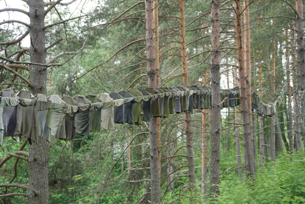 160 Herrenjacken, die zwischen Nadelbäumen Polonäse tanzen und langsam verwittern. Diese Installation, von der ich den richtigen Titel vergessen habe, ist Teil eines Skulpturenparks, den wir uns in Umedalen anschauen. Auf einem Campus, dessen rote Häuser an die 30er-Jahre-Bauten in Adlershof erinnern, stehen locker verteilt Werke von Künstlern unterschiedlicher Nationalitäten. Auf Tafeln wird erklärt, was sich der Künstler dabei gedacht hat.
