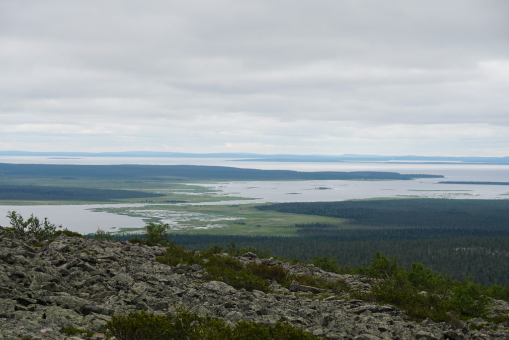 Aber für eine kleine Wanderung bleibt natürlich immer ein bisschen Zeit und so erkunden wir das Naturschutzreservat Sompio: zunächst stapfen wir durch sumpfige Gebiete mit Millionen von Mücken (Autan wirkt!) und klettern dann über endloses Geröll aus rotem Granit bis zum Gipfel Pyhä-Nattanen. Leider macht sich die Sonne rar, aber der Blick ist trotzdem grandios!