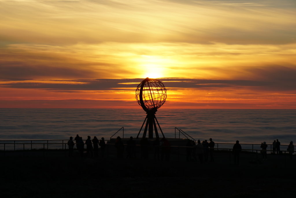 Wir sind wahrlich nicht alleine hier. Einige Wohnmobilisten holpern mit ihren Gefährten über große und kleine Steine, um die bestmögliche Aussicht zu ergattern. Wir begnügen uns vorläufig mit der zweiten Reihe und streben sogleich dem berühmten Globus entgegen. Diesen ersten Fotos werden unzählige folgen, das nächste könnte ja doch noch ein bisschen spektakulärer werden. Gegen 23 Uhr positionieren wir uns mit dem Stativ an einer strategisch günstigen Stelle und wollen den Lauf der Mitternachtssonne einfangen. Es herrscht eine Stimmung wie zu Silvester, erste Sektgläser werden von den aus zahlreichen Bussen ausgespuckten Touristen geleert. Über dem Meer steigt Nebel hoch. Die Frage, ob die Sonne noch so tief sinken wird, dass sie wieder unter der Wolke hervorkommt, wird heiß diskutiert. Kurz nach Mitternacht leert sich das Plateau, aber das kann es doch noch nicht gewesen sein . Wir haben doch Sommerzeit?! Gegen halbeins weicht das Abendrot der Morgenröte und die Sonne beginnt wieder zu steigen. Es ist wirklich taghell, mein Biorhythmus total durcheinander. An Schlaf ist erst mal nicht zu denken.