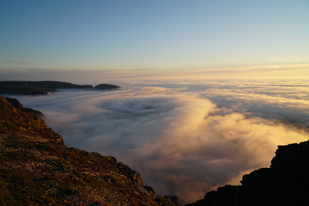 Das Wetter bleibt schön und wir beschließen, noch einen weiteren Tag hier zu verbringen. Obwohl sich hier so viele Leute aufhalten, herrscht eine angenehme Ruhe, vom Meer unter uns dringt kein Laut nach oben, es bleibt den ganzen Tag windstill. Wieder wird der Ozean von dichten, weißen Wolken zugedeckt. Die Welt scheint stillzustehen, nur die Sonne zieht ihre Bahnen. Es wirkt irgendwie mystisch.