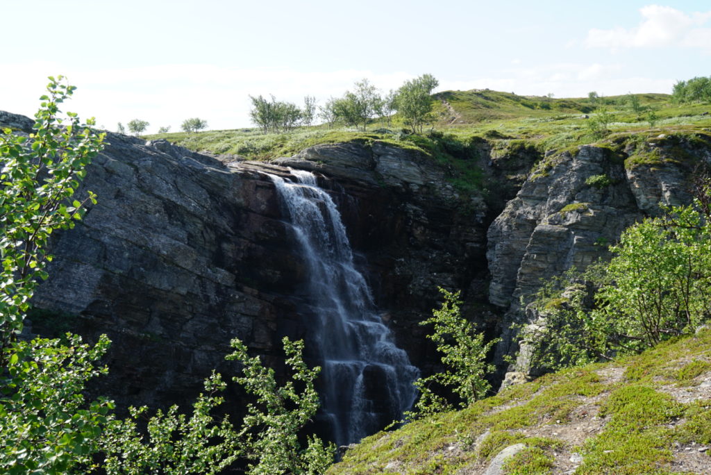 Unsere Frühstückspause genießen wir im Schatten von kleinen, gedrungenen Birken mit Blick auf einen Wasserfall.
