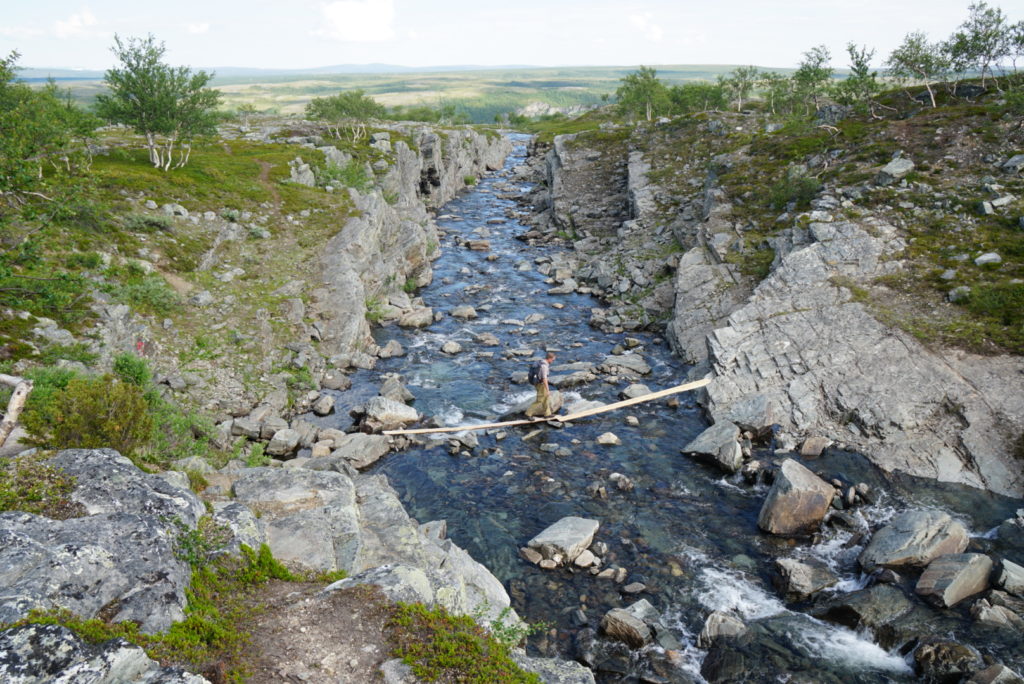 Als nächstes steht eine Wanderung durch den Fjell zum größten Canyon Nordeuropas, dem Sautso Canyon in der Nähe von Alta, auf dem Programm. Der Weg durch die karge, hügelige Landschaft ist erstaunlich abwechslungsreich. Immer wieder kreuzen kleine und große Bäche unseren Weg, die wir von Stein zu Stein hüpfend oder auf schmalen, wackligen Brettern balancierend überqueren.