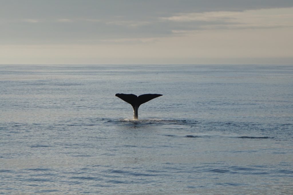 So fahren wir auch nur ca. 45 Minuten bei schönem Wetter und relativ ruhiger See zum Jagdgebiet der Wale, wo unser Schwesterschiff schon Ausschau hält, und haben auch gleich Glück. Ein ca. 15 Meter langer Pottwal ist gerade wieder aufgetaucht und muss nun erstmal ein paar Minuten Luft holen, bevor er erneut abtaucht. Dann ruft unser Kapitän „diving“ und um uns herum klicken wie wild die Fotoapparate, um die aufrecht stehende Schwanzflosse digital einzufangen. Einen Sprung wird es in diesen kalten Gewässern nicht geben – das kostet zu viel Energie – und außerdem sind ja auch keine Weibchen hier, den man imponieren könnte. Auch mehrere Wale gleichzeitig sind nicht zu sehen – sie sind Einzelgänger.