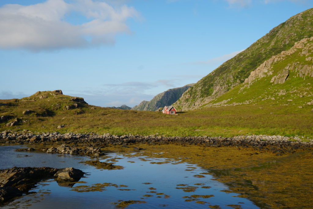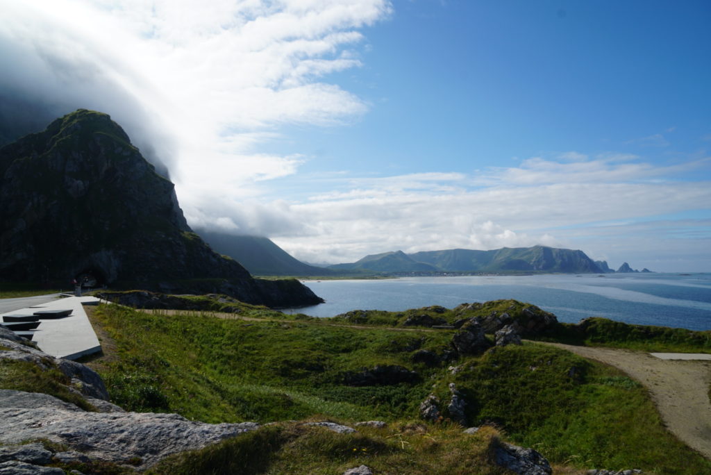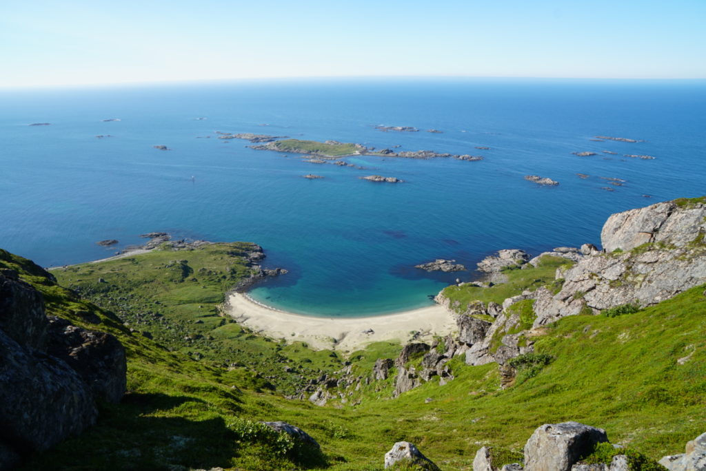 Dem entsagen wir jedoch und machen uns bei perfektem Wetter auf zu unserer bislang schönsten, aber auch schwersten Wanderung, der Dronningruta. Zuvor werden wir noch von der lokalen Presse zur Toilettensituation auf den Wanderwegen interviewt, dann starten wir in Richtung Stø. Und diese Tour bietet uns eine Menge: zunächst bequeme Wege über Wiesen mit reifen Moltebeeren, dann steile Anstiege, morastige Küstenabschnitte, weiße Sandstrände mit türkisblauem Wasser bis hin zur Kletterei auf allen Vieren über Felsen. Jetzt wissen wir, was ein schmaler Grat ist! Nach fast 20 km, insgesamt ca. 1.200 Höhenmetern rauf und runter und 9 Stunden sind wir überglücklich, wieder in unserem mobilen Zuhause zu sein, und fallen völlig erledigt auf unsere Betten. Da hätte mich auch der schönste Sonnenuntergang nicht mehr hochgebracht. Aber ich werde auch nicht in Versuchung geführt, denn kurz nach unserer Rückkehr werden wir von dickem, weißem Nebel eingehüllt.