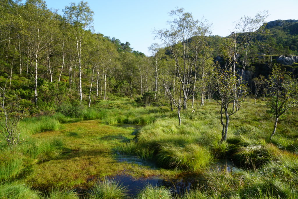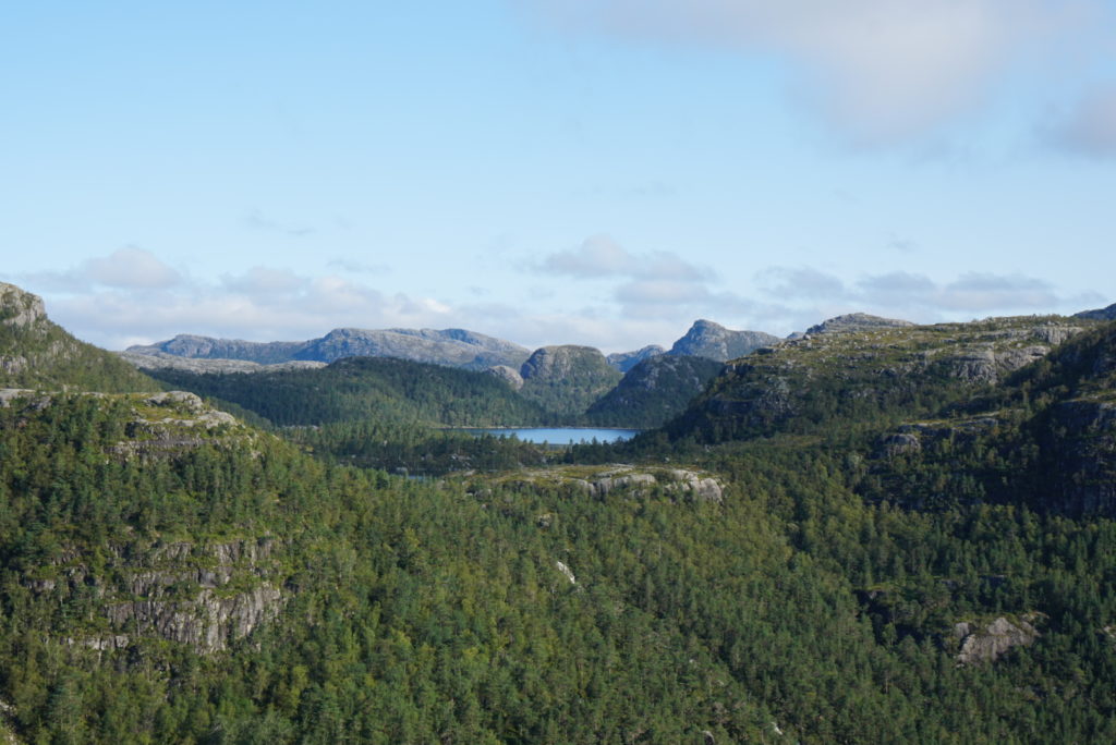 Am nächsten Tag kommt wie versprochen die Sonne heraus – gerade rechtzeitig zu unserer letzten großen Wanderung. Wir sind (für unsere momentanen Verhältnisse) extrem früh aufgebrochen, aber natürlich sind wir nicht alleine, denn wir wollen zum Preikestolen. Eigentlich eine schöne, abwechslungsreiche Wanderung – wenn es nur nicht so voll wäre. Auf dem Rückweg passieren wir eine nicht enden wollende Völkerwanderung. Aber die Aussicht auf das Felsplateau, das 604 Meter senkrecht bis zum Fjord abfällt, ist trotzdem lohnenswert!