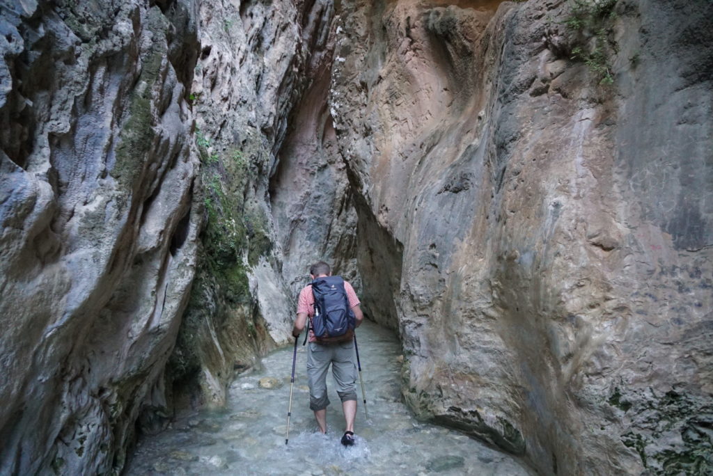 So schön ist der Strand nun auch wieder nicht, auf dass wir ein wenig das Hinterland erkunden wollen. Mit dem Rad fahren wir zum Naturpark der Sierras Tejeda, Almijara y Alhama zu einer wirklich spektakulären Wanderung am und vor allem im río Chillar. Gut ausgerüstet mit wasserfesten Sandalen und Wanderstöcken spazieren wir zunächst durch das breite, fast ausgetrocknete Flussbett, das sich jedoch bald verengt. Durch die vergangenen Regenfälle ist der Wasserstand gestiegen und wir waten bald durch das teils knietiefe, klare Wasser, durchqueren kleine Stromschnellen und Schluchten, die manchmal nur noch eineinhalb Meter breit sind.