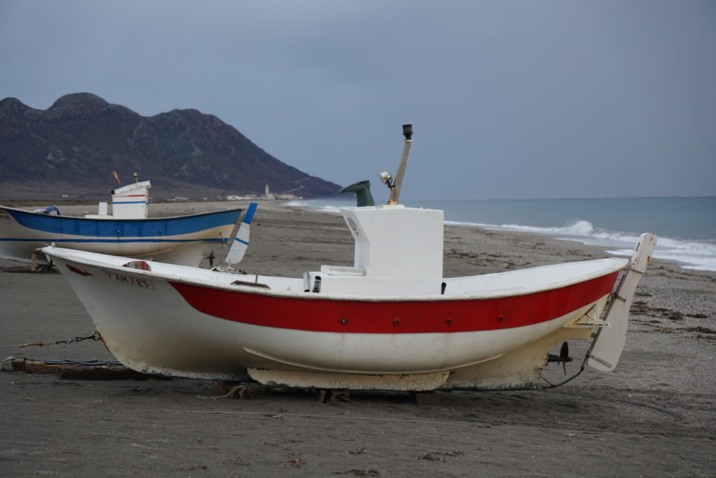 Auf unserem Weg liegt der Naturpark Cabo el Gata-Nijar, in dem es nur 25 Tage pro Jahr regnen soll. Gerade am Meer angekommen, gibt es den nächsten Wolkenbruch, der für die an die extreme Trockenheit angepasste Fauna und Flora für das ganze Jahr reichen müsste. Den Nachmittag vertreiben wir uns mit der Autobiografie von Käpt’n Blaubär. Vielleicht um uns zu versöhnen, kriecht am Abend doch noch mal kurz die Sonne hervor.